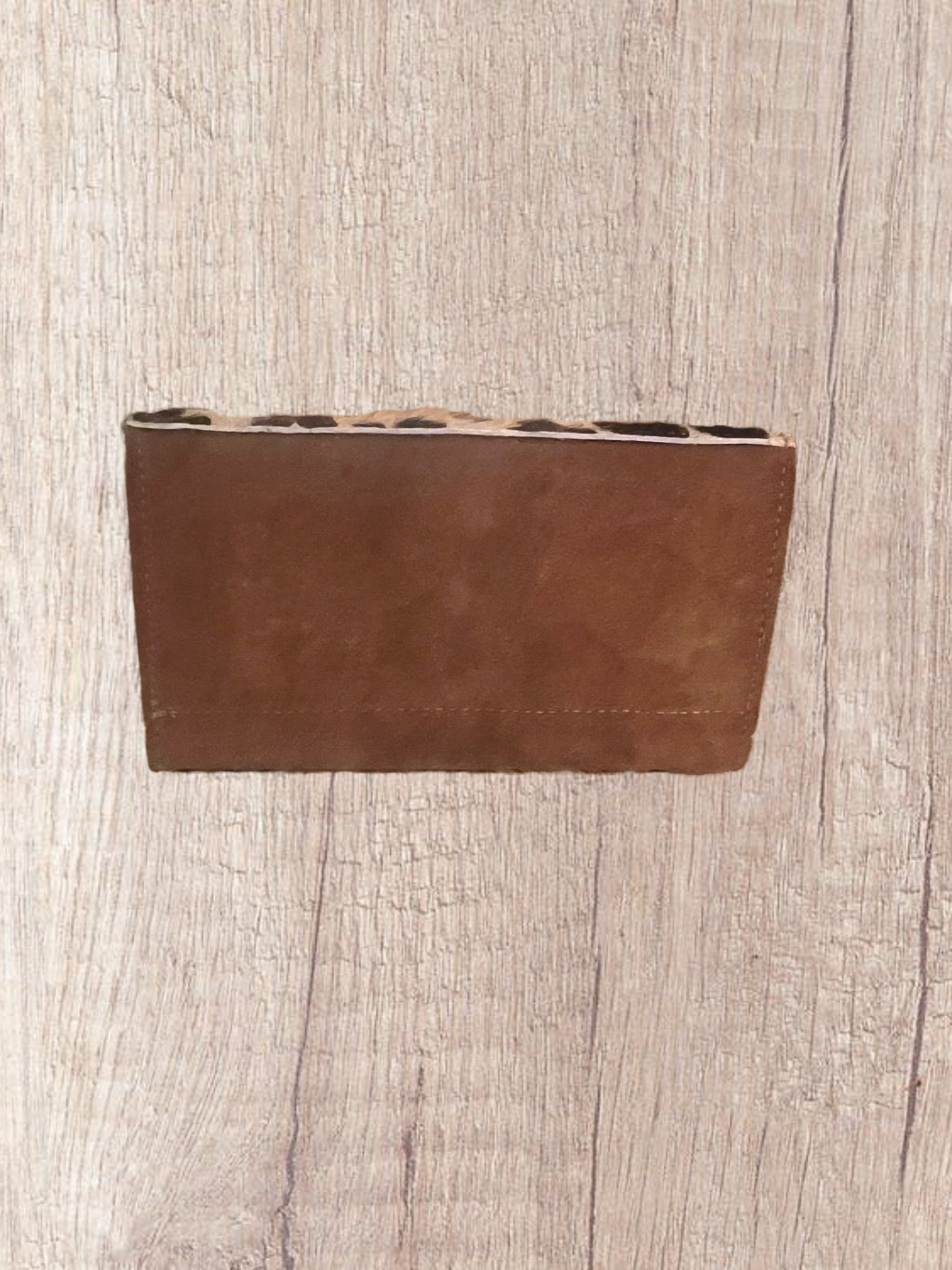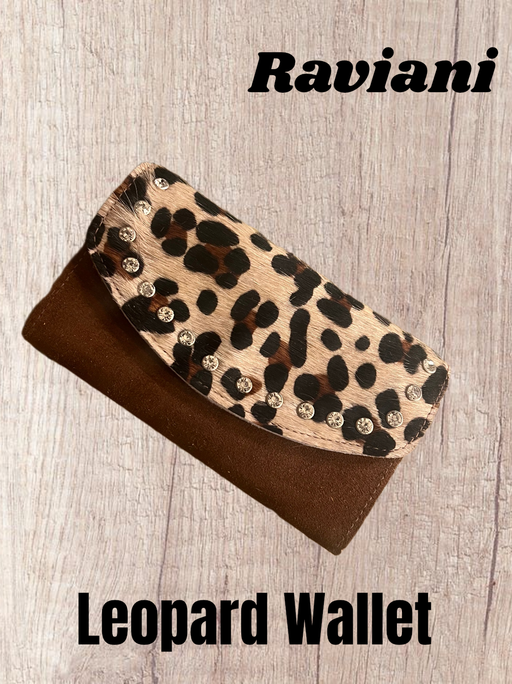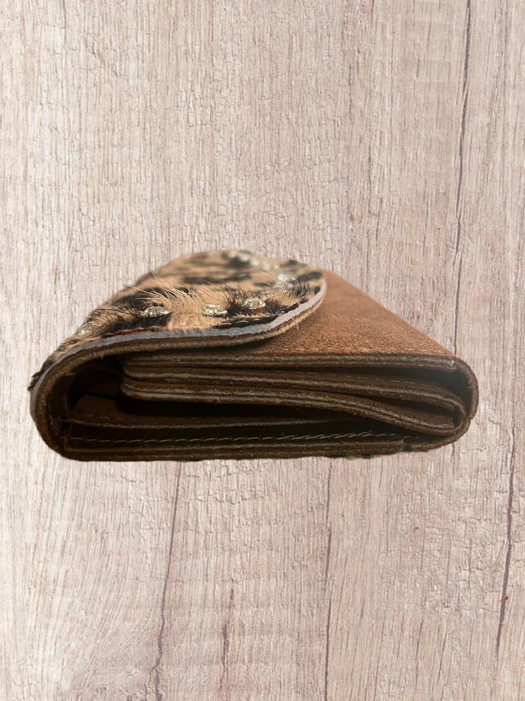 Tri-fold Linda's wallet in brown suede & calfskin Leopard flap with clear crystals.