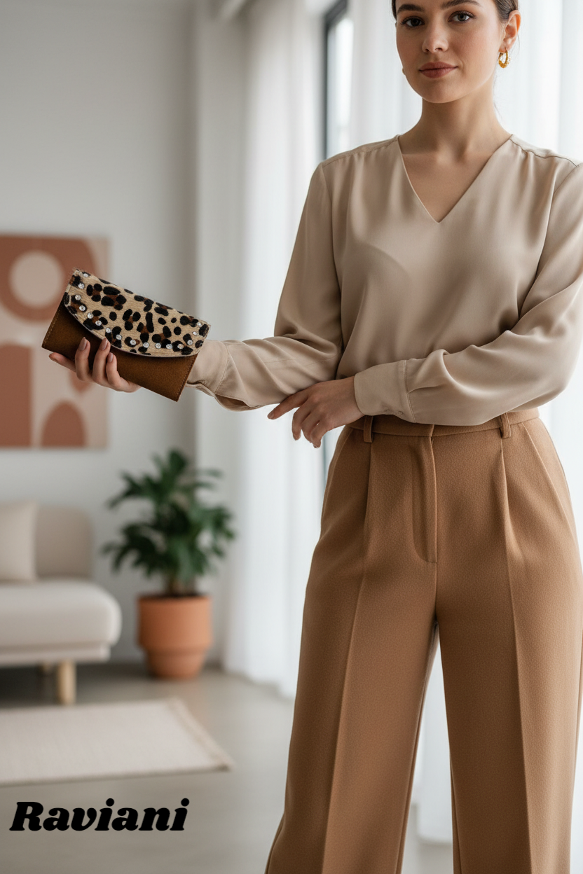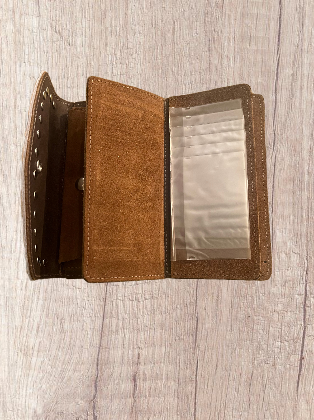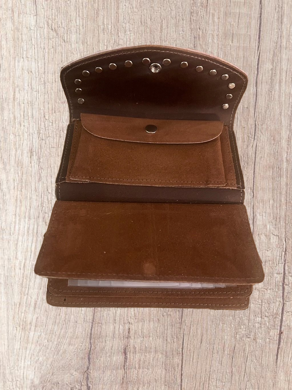Tri-fold Linda's wallet in brown suede & calfskin Leopard flap with clear crystals.